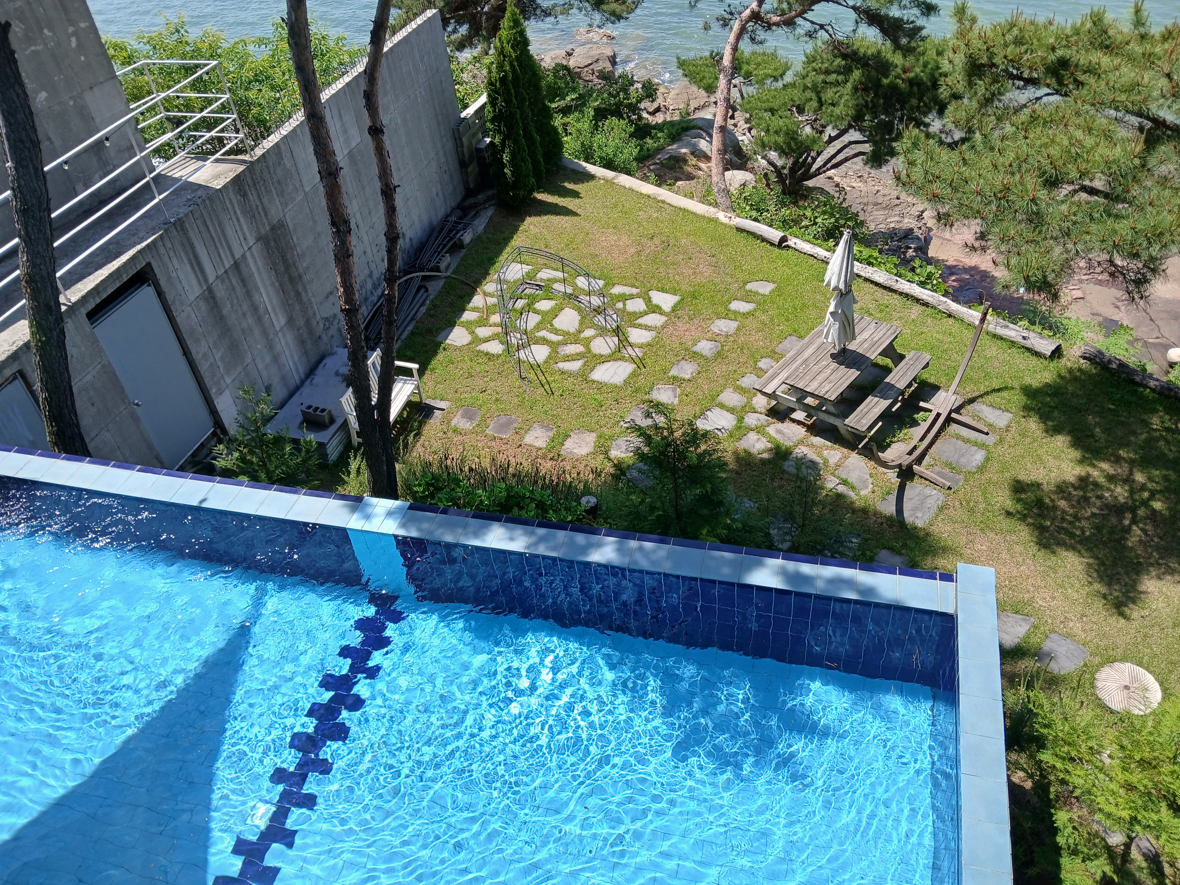 정원을 따라 걷다 보면 바다 쪽으로 시야가 확 트이는데, 순간 "와..." 소리가 절로 나옵니다. 정말 카페가 바다 위에 떠 있는 느낌이에요. 건물 구조가 해변 쪽으로 돌출되어 있어서 그런지, 창밖으로 보이는 바다 뷰가 환상적이에요.