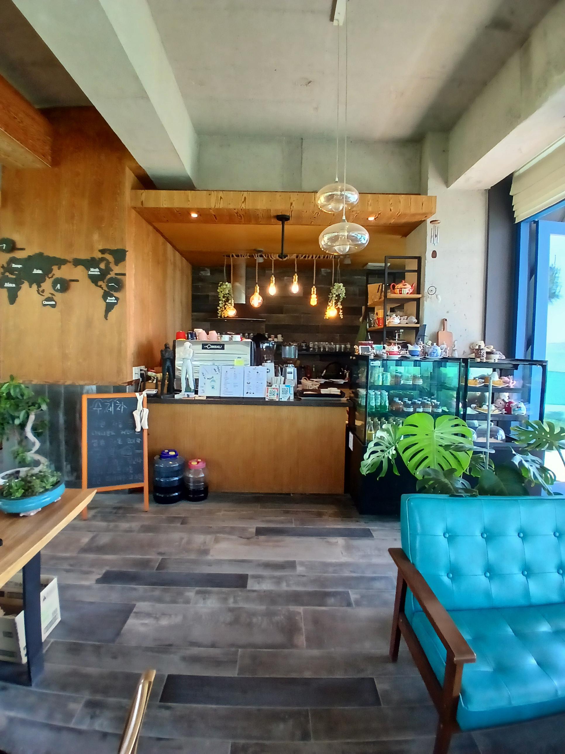 실내는 모던하면서도 심플한 분위기였고, 창이 커서 어느 자리든 탁 트인 바다를 감상할 수 있었어요. 오전 일찍이라 카페에 손님이 우리밖에 없어서 더욱 만족스러운 시간이 되었답니다.